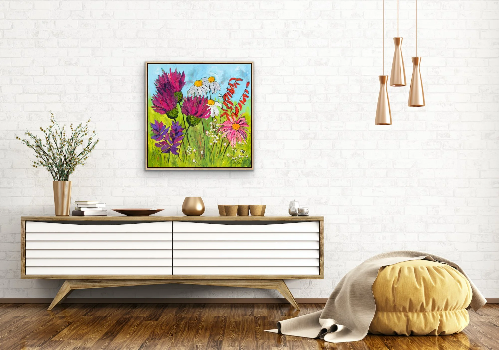I have spent many afternoons hiking the the Sandy Seep Trail near my home. In late summer there are some amazing wild flowers growing along the trail — some of my favorites are the penstemon, purple coneflowers, sunflowers and thistle. I often take pictures so I can use them for reference when I get back to the studio. If you love wild flowers as much as I do then this painting is for you. It would look fantastic hanging in any space in your home.