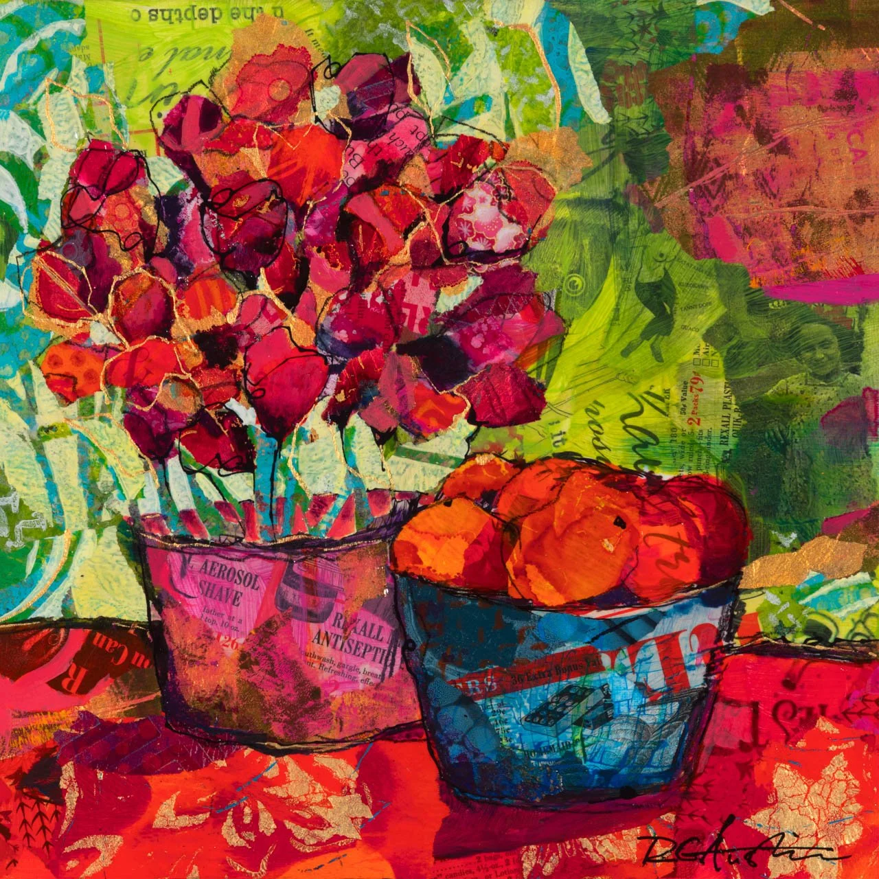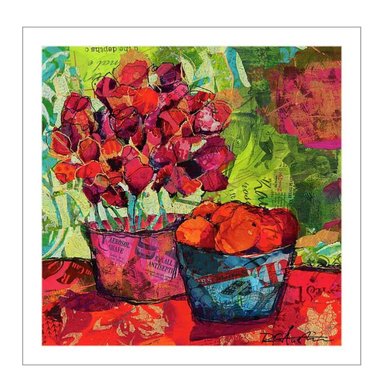 Isn't it wonderful how the simplest things can bring such joy? Like finding a bright pot of flowers keeping company with sun-ripened oranges - the kind of everyday magic you might discover on a grandmother's windowsill. This print celebrates those quiet, cheerful moments when ordinary things arrange themselves into something special.