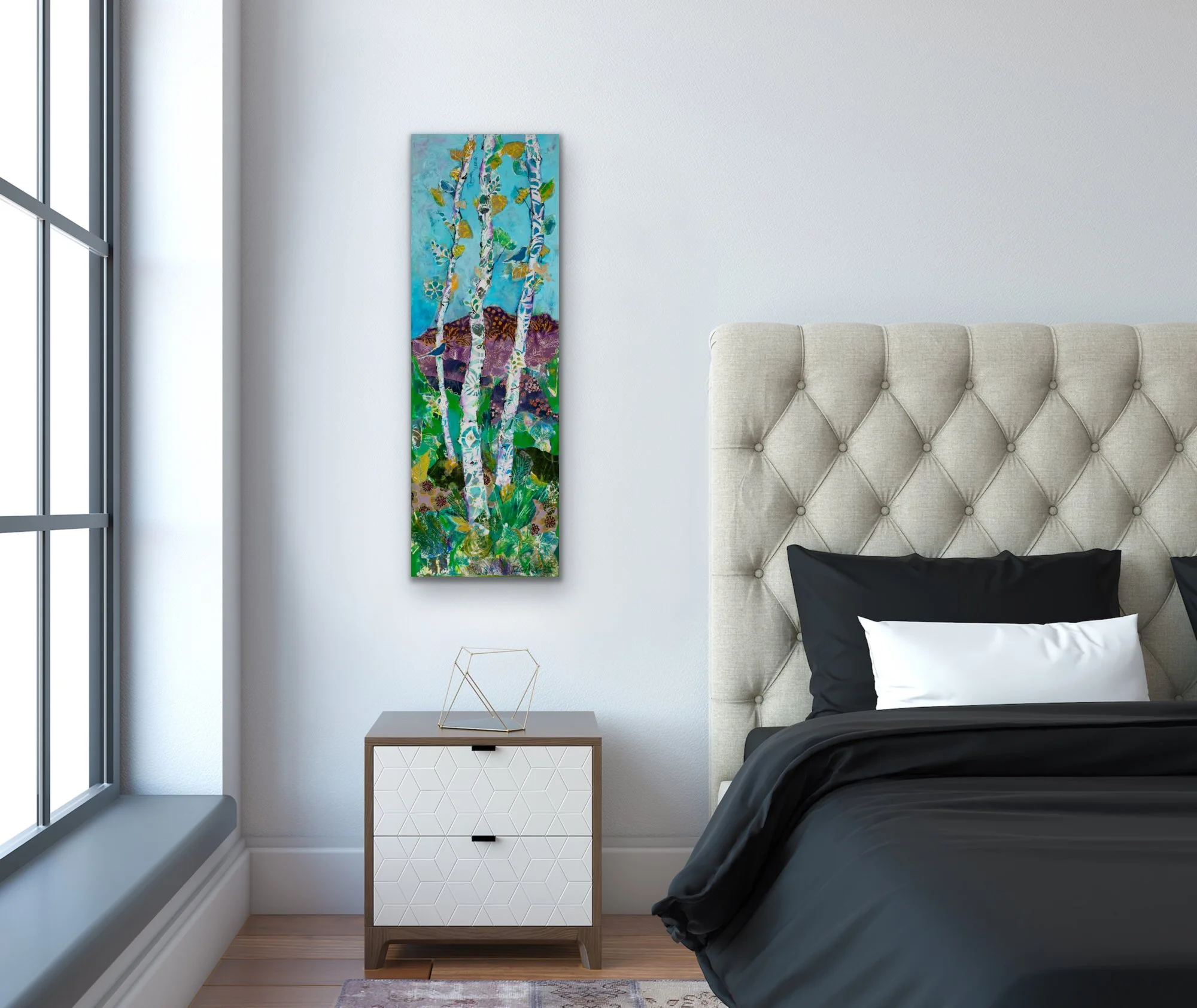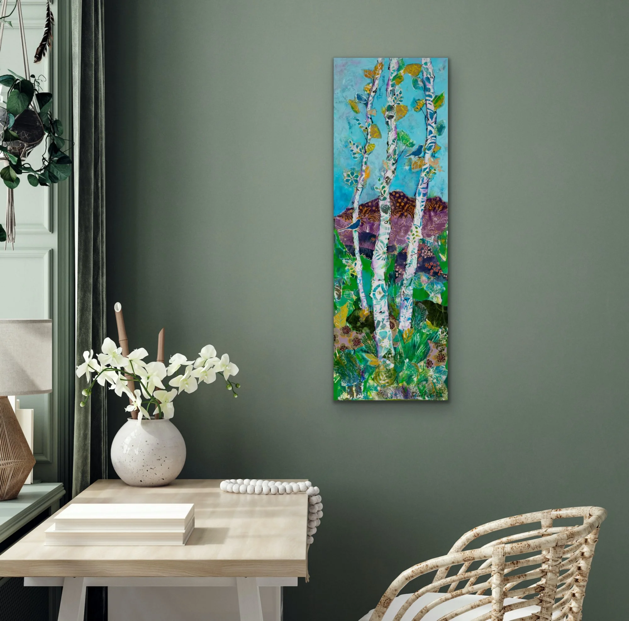 From my original mixed media painting, this art print brings home the beauty of a summer day on Flagstaff's Hart Prairie trails. Graceful aspen trees stand bright against a turquoise Arizona sky, with mountain wildflowers dotting the grassland below in greens and purples. It's a reminder of those perfect moments when the trail opens up and takes your breath away.